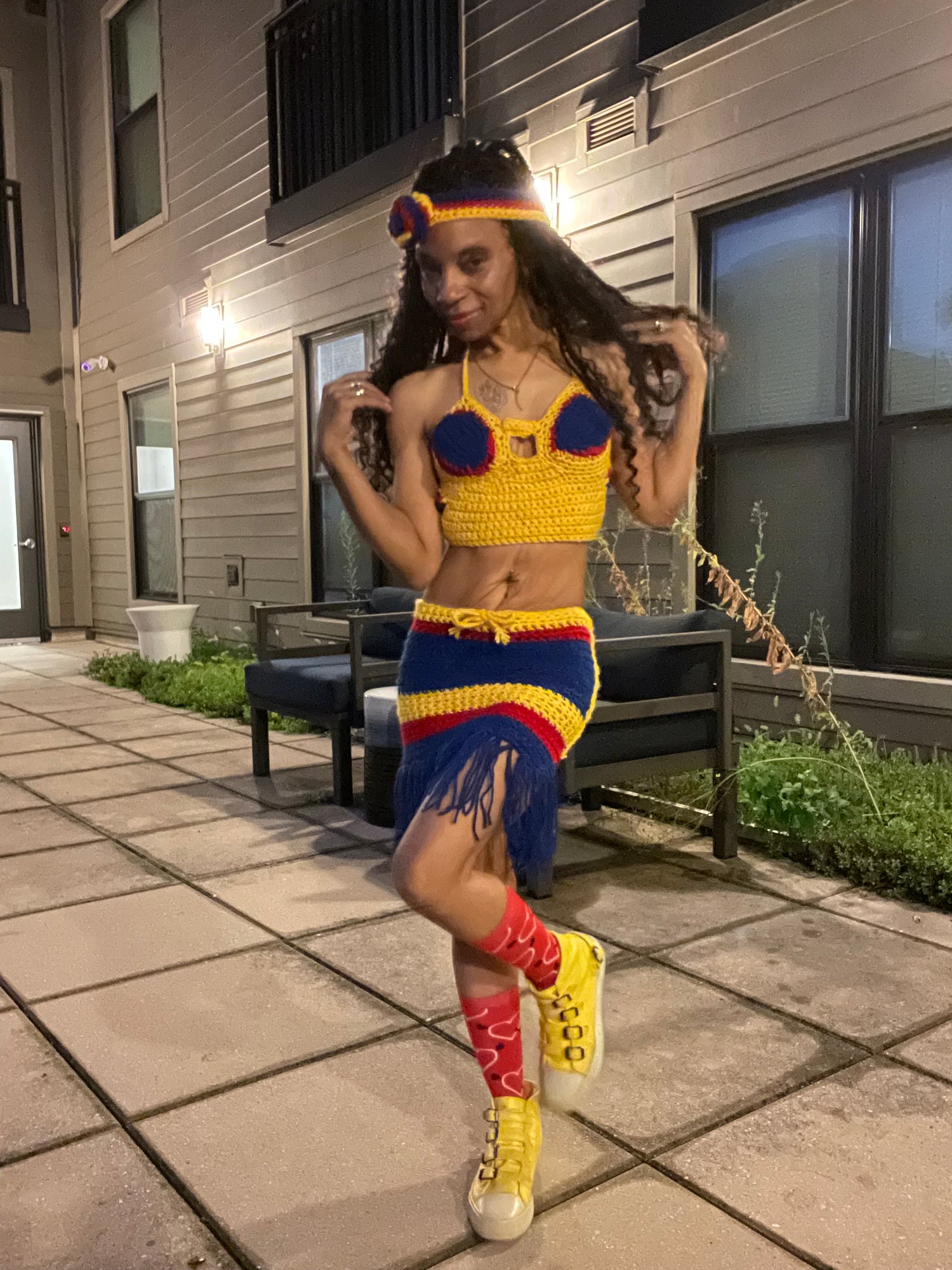 Crochet Three Piece Skirt Set With Cropped Topand Matching Headband