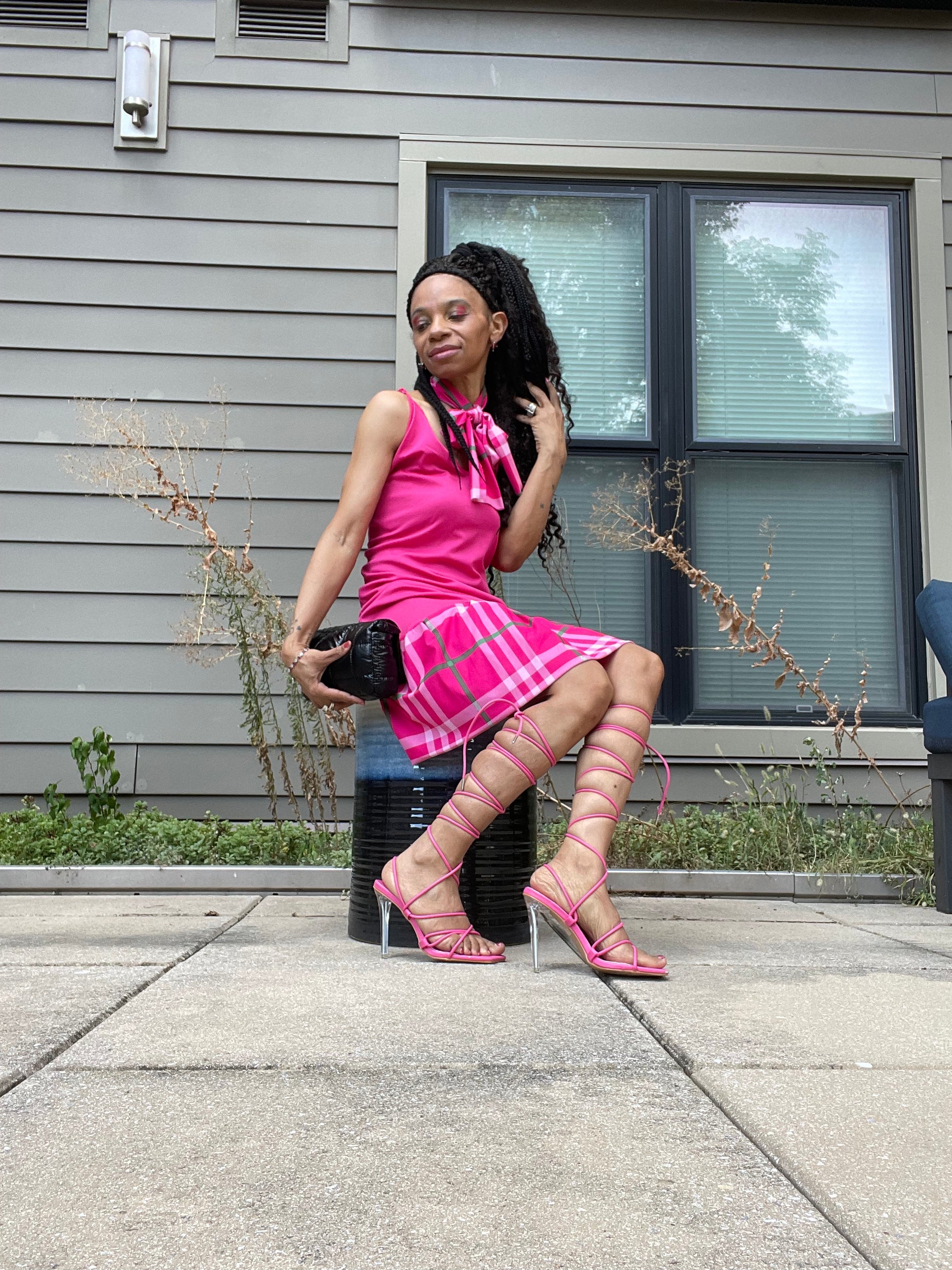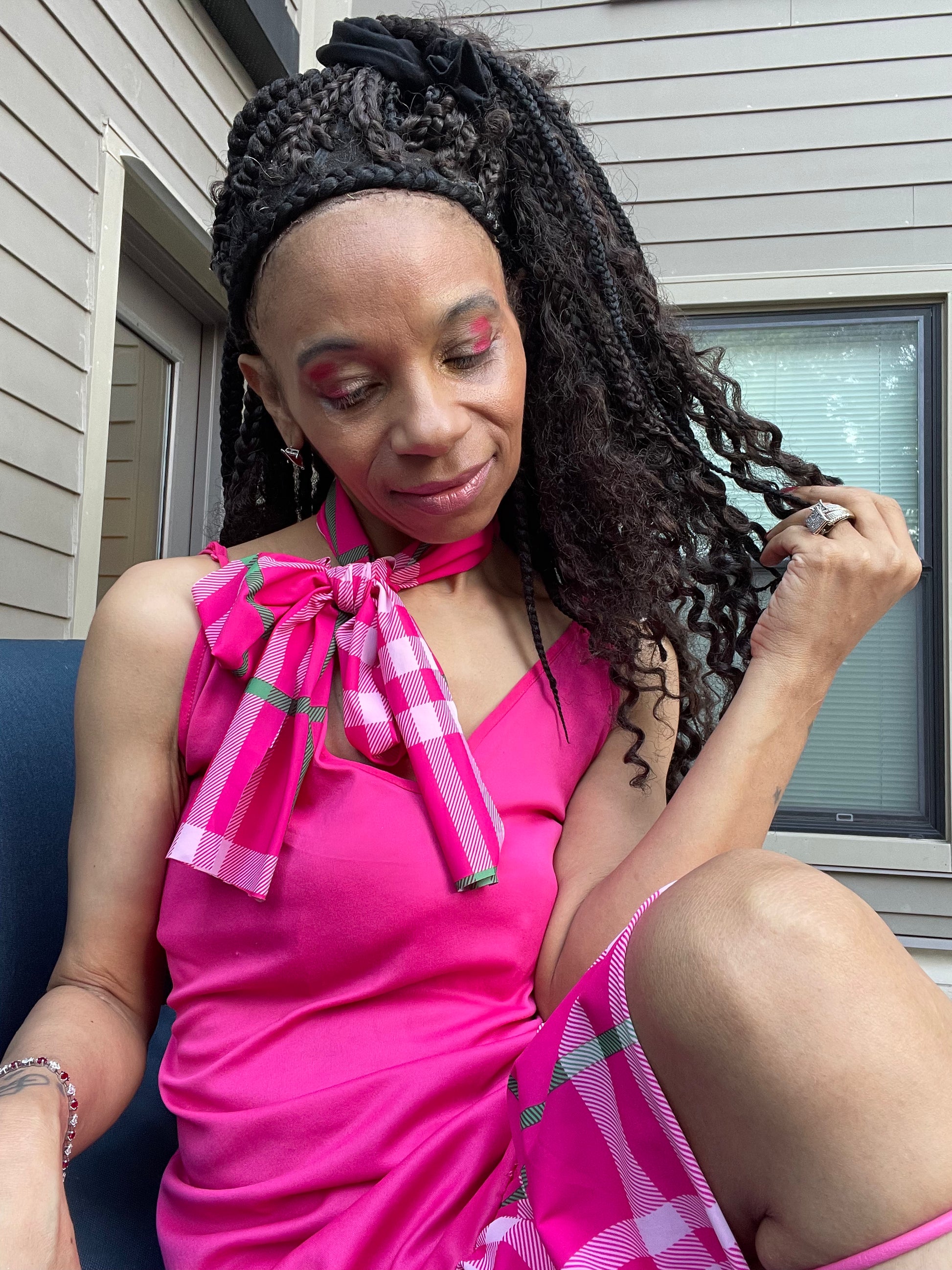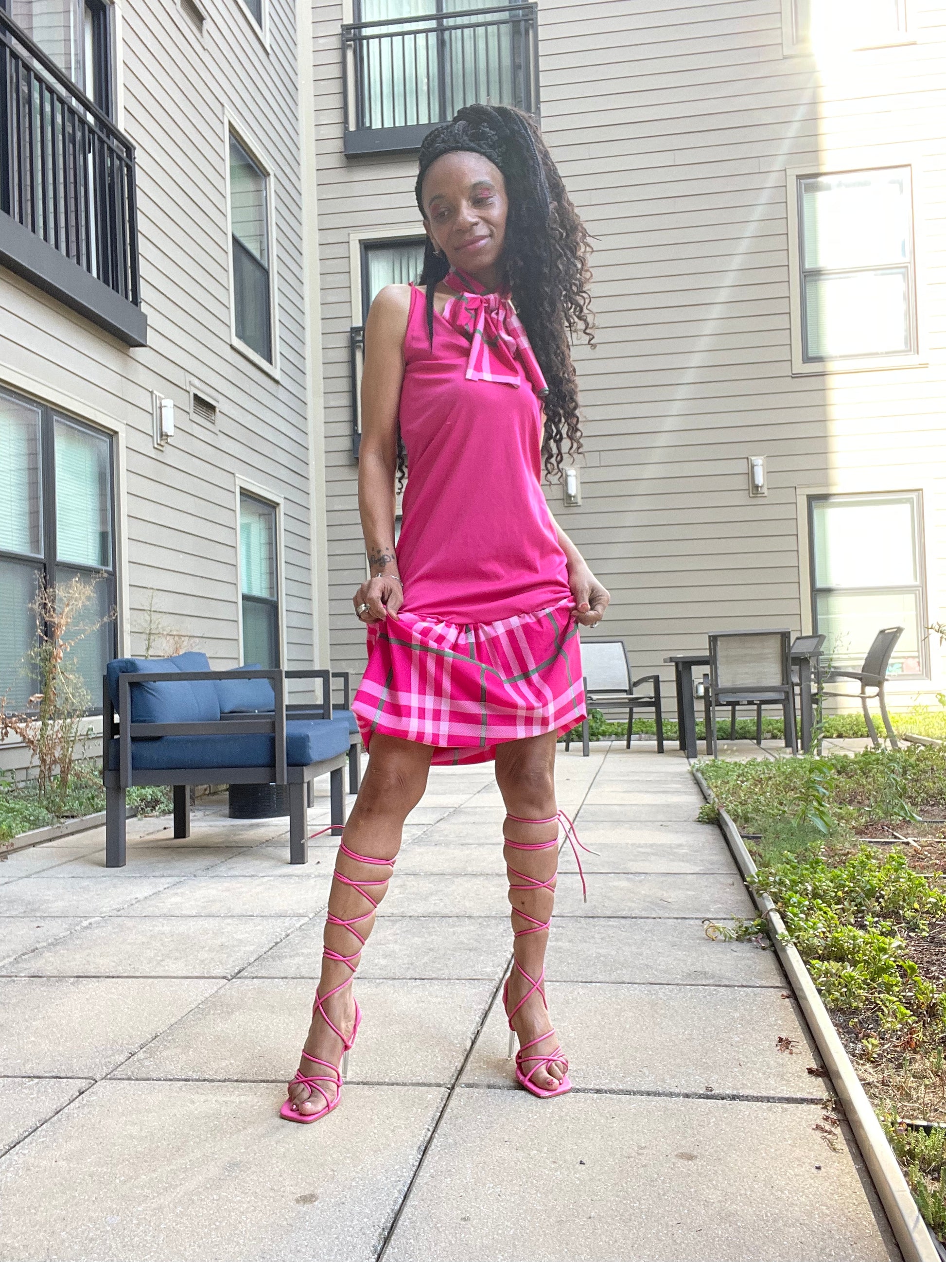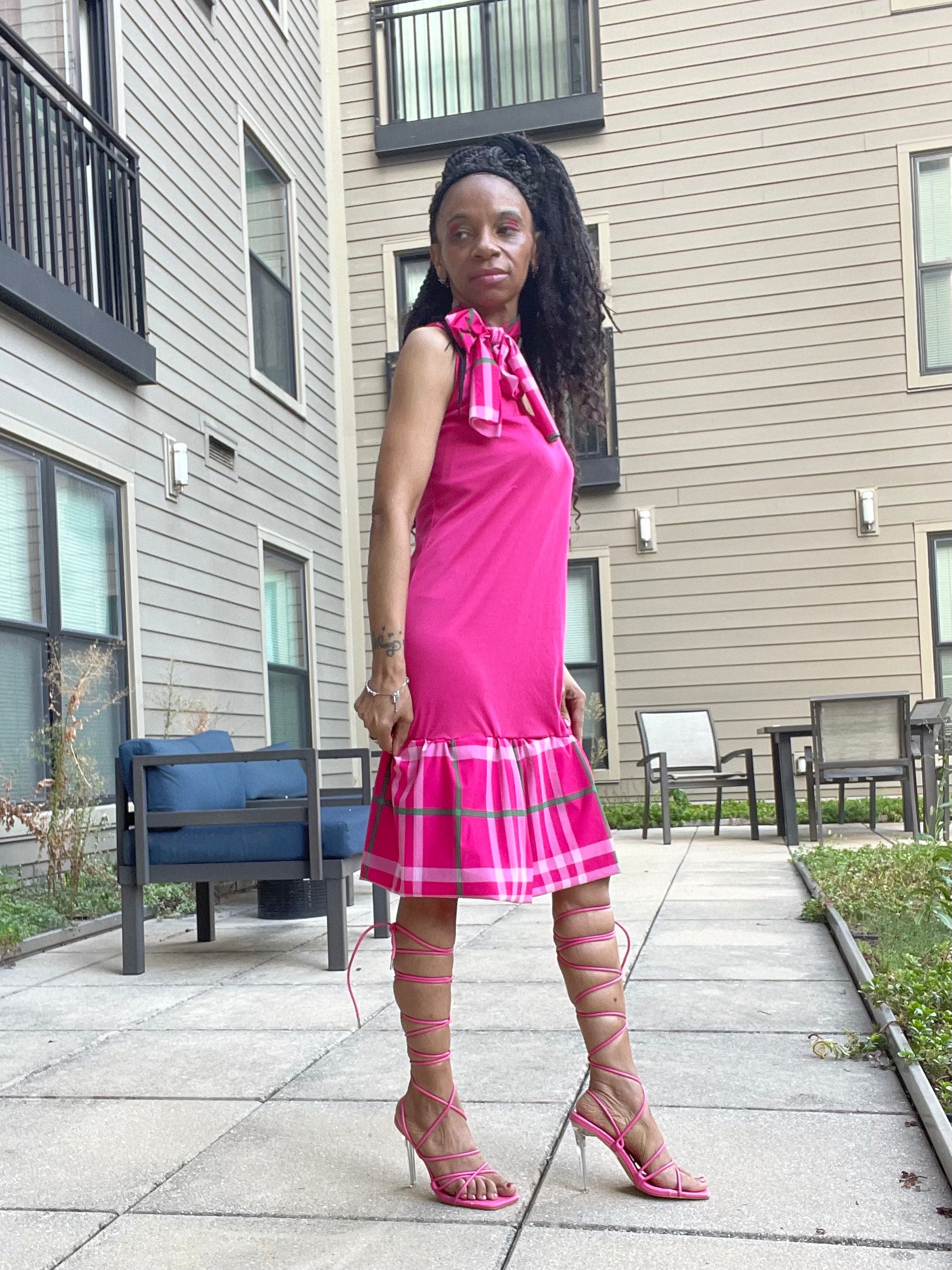 Pink one of a kind custom-made dress if you would like to order one definitely put your order in and push what color you would like it in can wait anywhere very easy flowing marvelous dress come in all sizes different colors, yellow blue, green purple cream